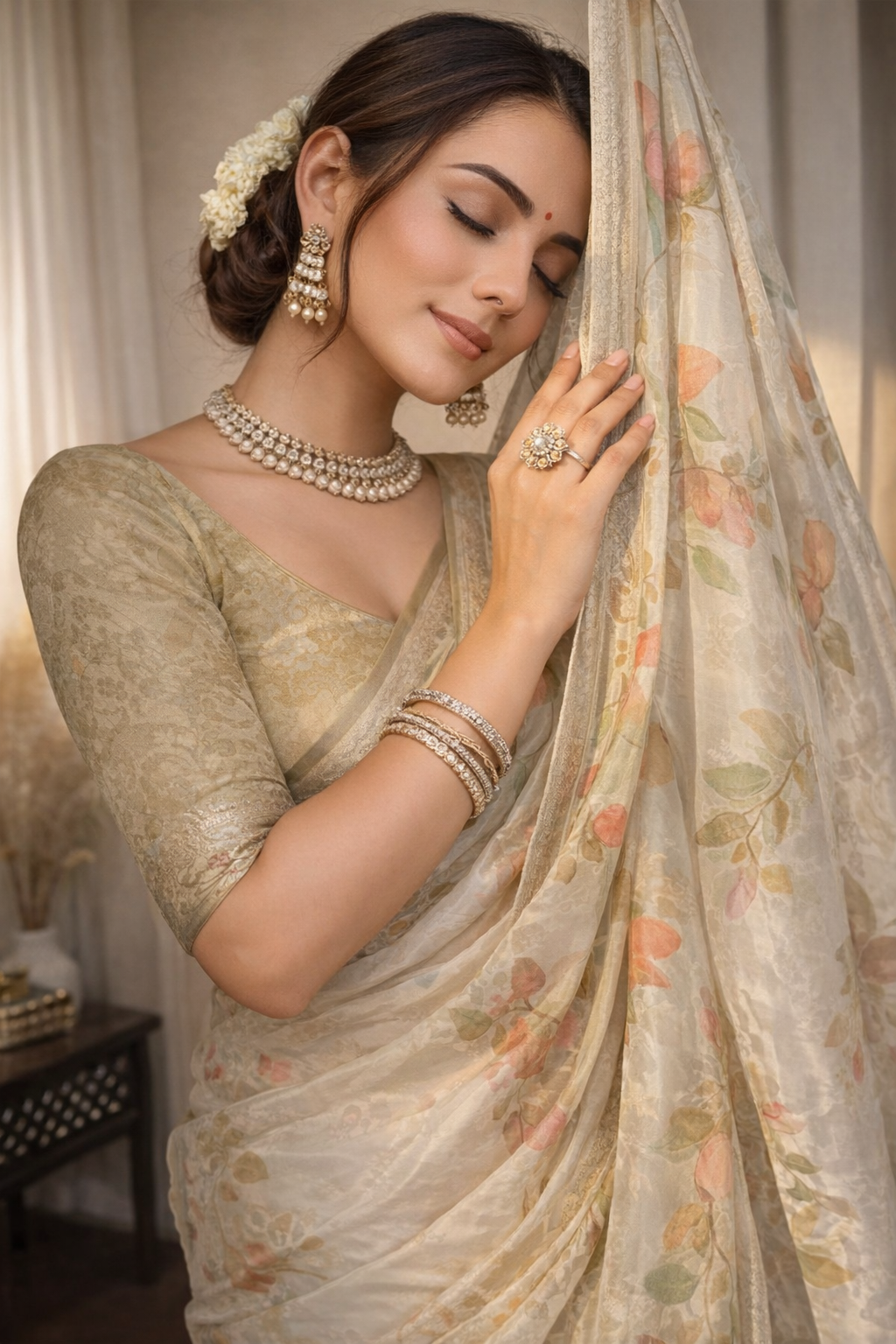 Milli Weightless Printed Saree – Elegant Beige Abstract Floral Designer Saree