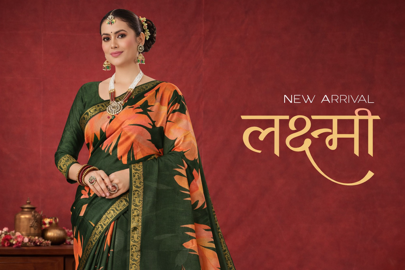 Laxmi 1992 Tusser Silk Green Floral Printed Saree with Zari Border