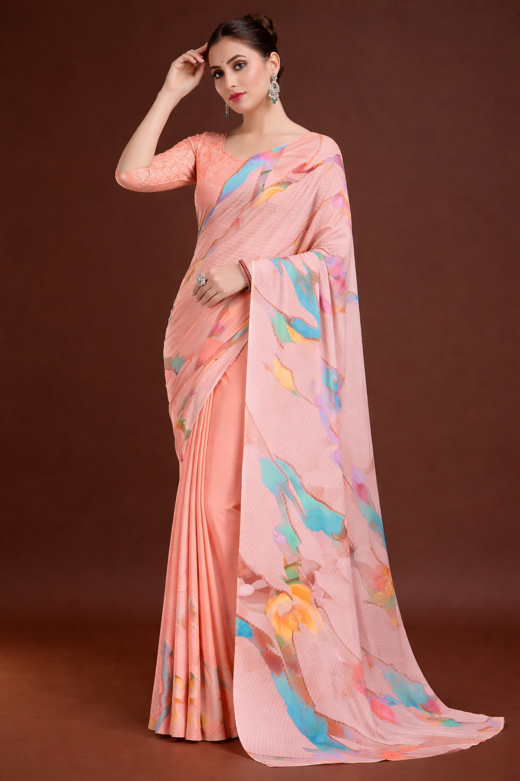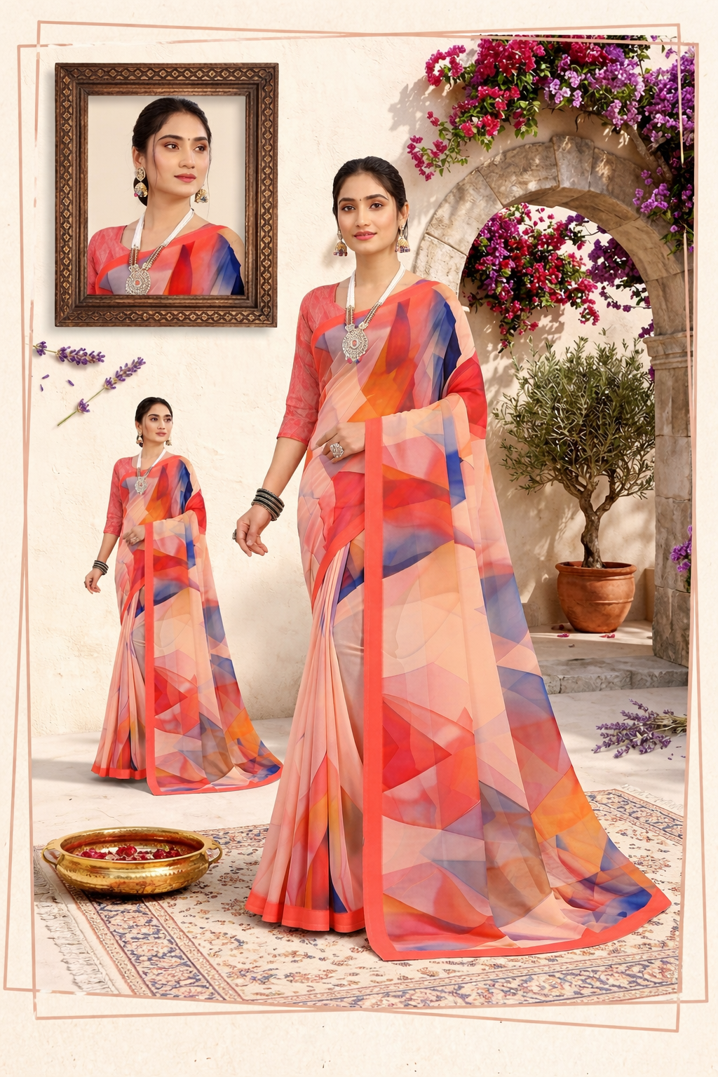 Milli Weightless Printed Saree – Elegant Peach Orange Geometric Designer Saree