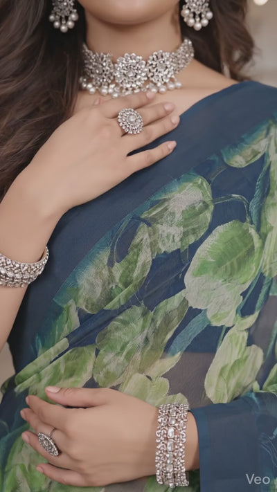 Step into effortless elegance with the Shristi 2122 Designer Printed Saree, a perfect blend of modern design and timeless ethnic charm. Featuring a deep navy blue base adorned with artistic green circular and leaf-inspired prints, this saree creates a refreshing and sophisticated look that stands out beautifully.