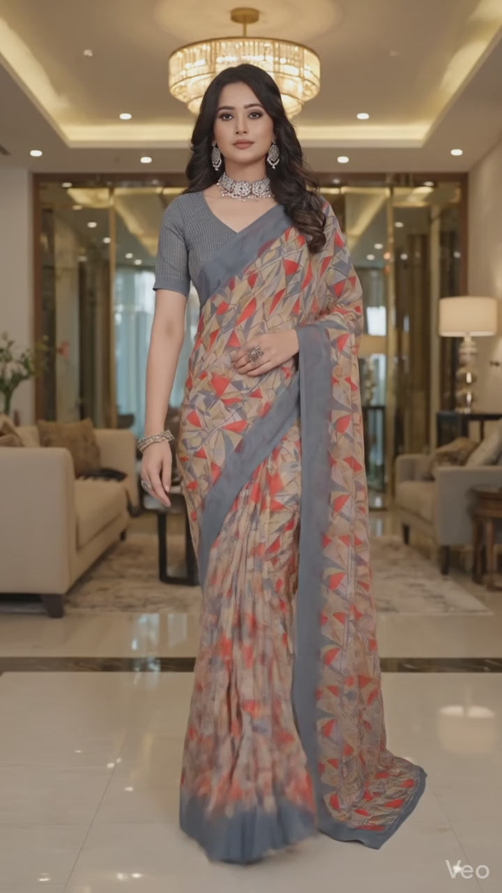 Add a touch of modern elegance to your ethnic collection with the Shristi 2123 Designer Printed Saree. This beautiful saree features a sophisticated grey base enhanced with vibrant geometric patterns in red and beige, creating a contemporary yet graceful look.