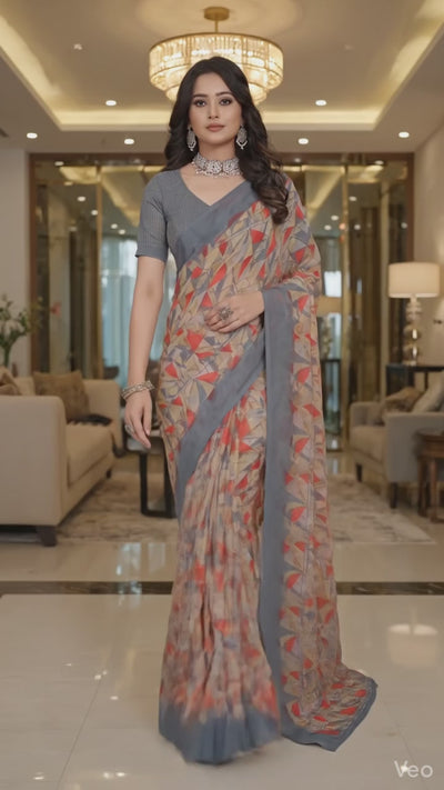 Shristi Designer Printed Saree – Stylish Grey Geometric Party Wear Saree